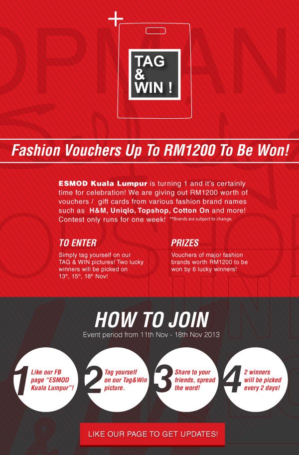 Esmod Kuala Lumpur is turning 1 and we are in the mood for some celebration! We are giving out RM1200 worth of vouchers for various fashion brand names such as H&M, Uniqlo, Topshop and more! Simply tag yourself on the designated pictures on our facebook page and stand a chance to win!